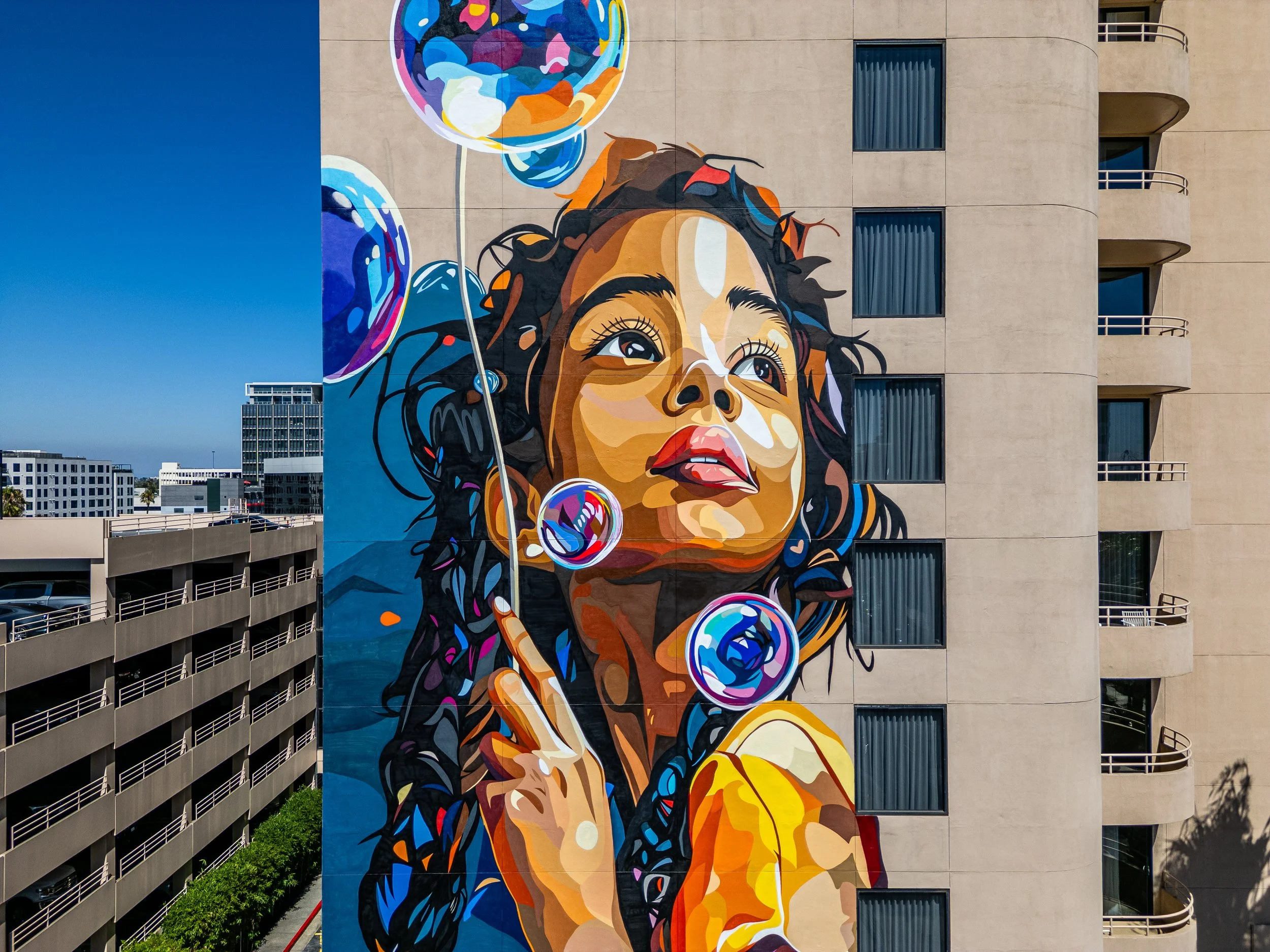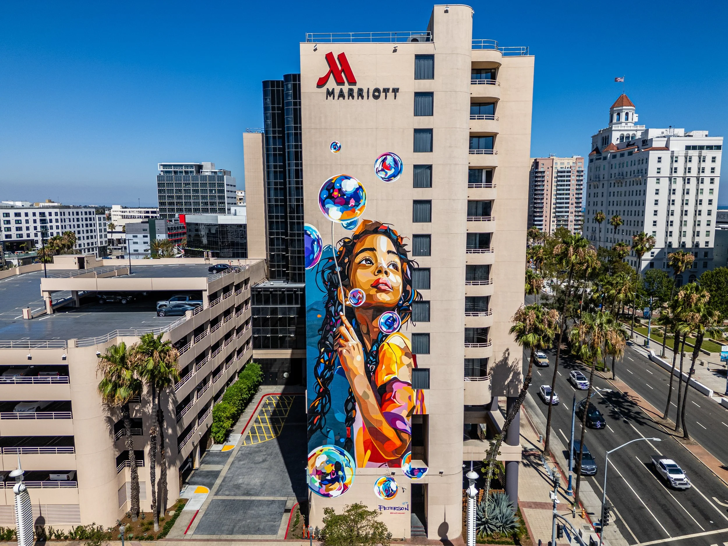 Designed for the city’s Marriott Hotel, the mural sweeps across an otherwise bare facade, bringing with it a vibrant optimism. A little girl peers toward the sky with hopeful eyes, bubbles circling her as they continue their climb up the building. The work is drenched in a complementary color palette, where blue and orange tones contrast yet still build off one another. The result is a charming sense of buoyancy, mimicking the bubbles that swirl around the central figure. Even so, these bubbles represent more than just playfulness.